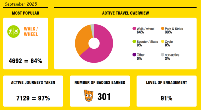 To enable us to monitor our progress through the challenges, our pupils record their journey to school every morning on the WOW travel tracker and at the end of the month if they have recorded three or more active journeys every week, they are awarded a badge. The travel tracker also allows them to monitor their own progress and how their class and the school are doing on the leaderboards.