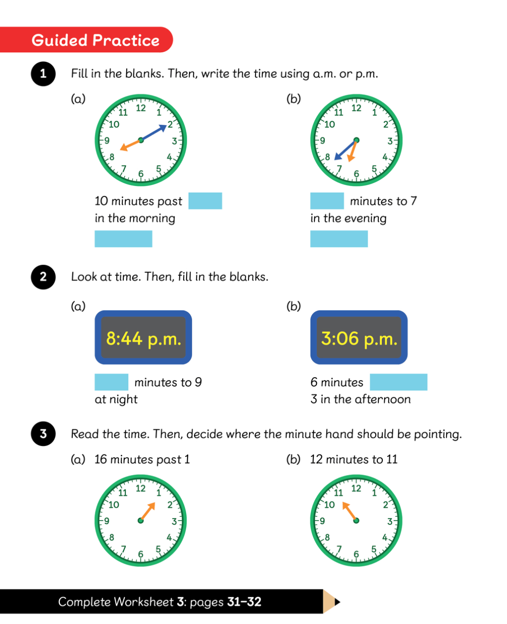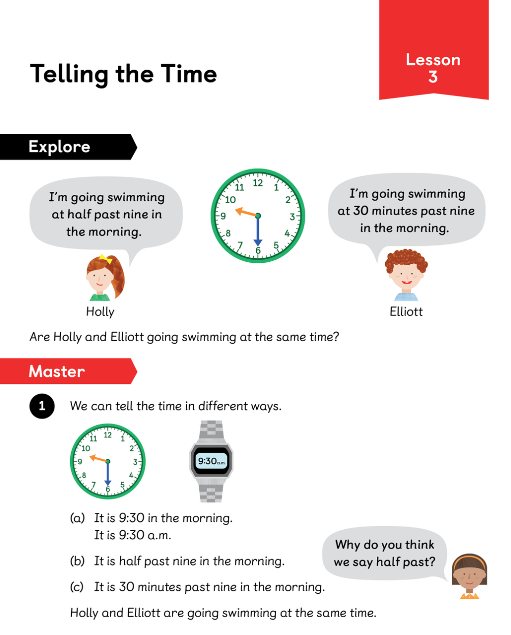 LC: To be able to tell time using vocabulary, such as o’clock, a.m./.p.m., morning, afternoon, past and to.