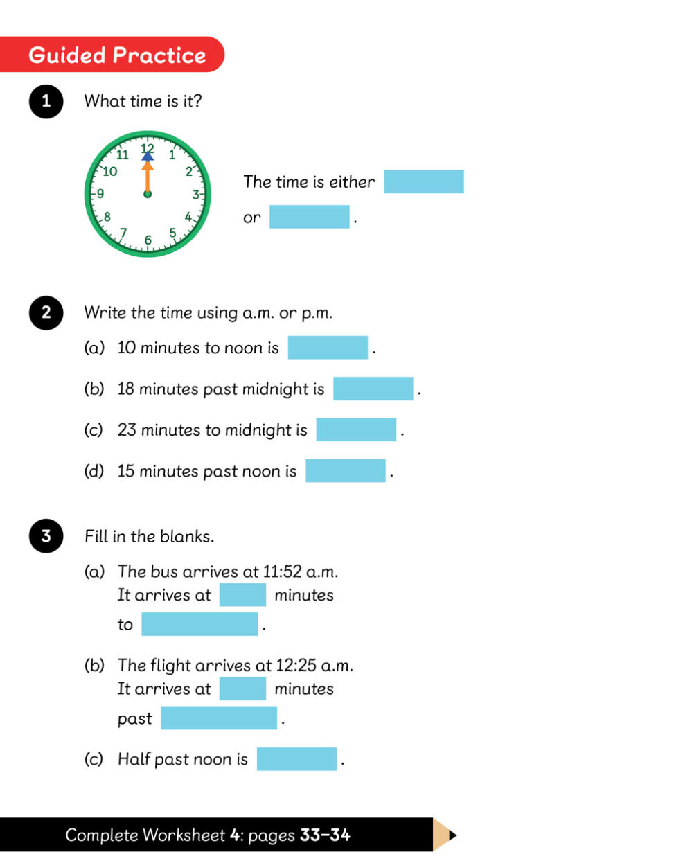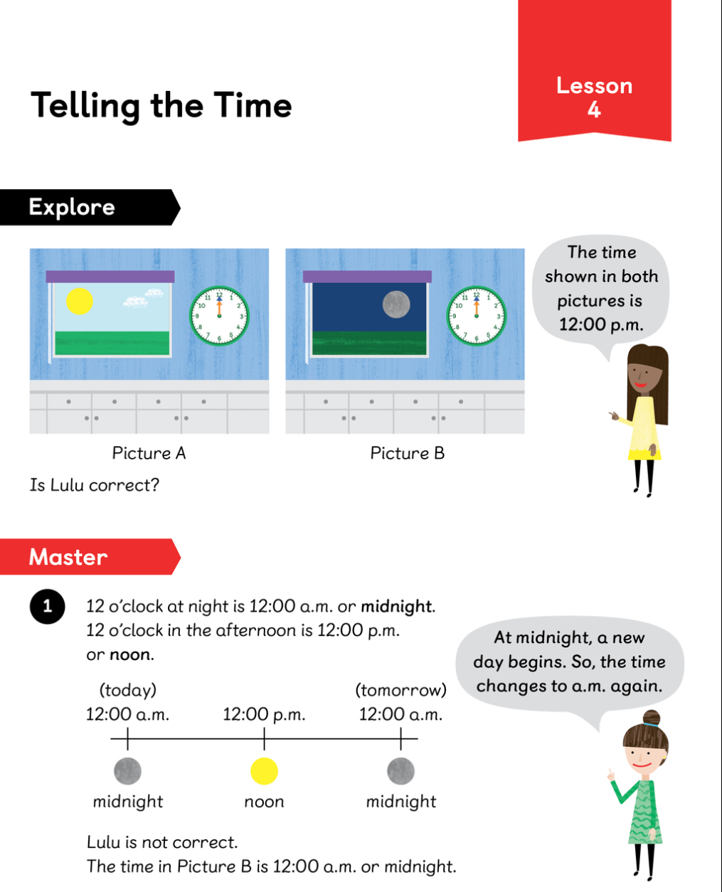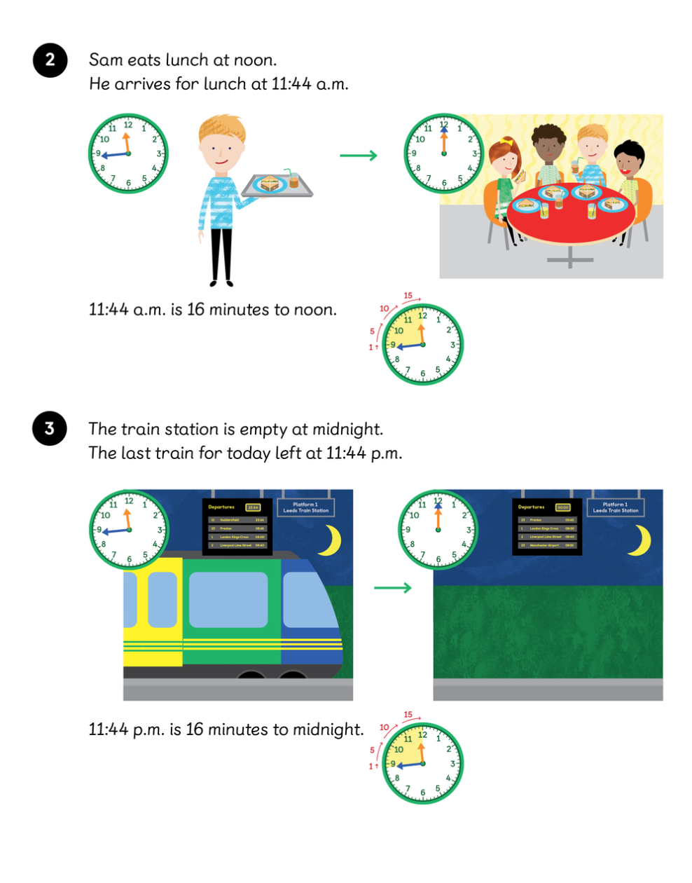 LC: To be able to tell time to the minute using vocabulary, such as o’clock, a.m./p.m., morning, afternoon, noon and midnight.