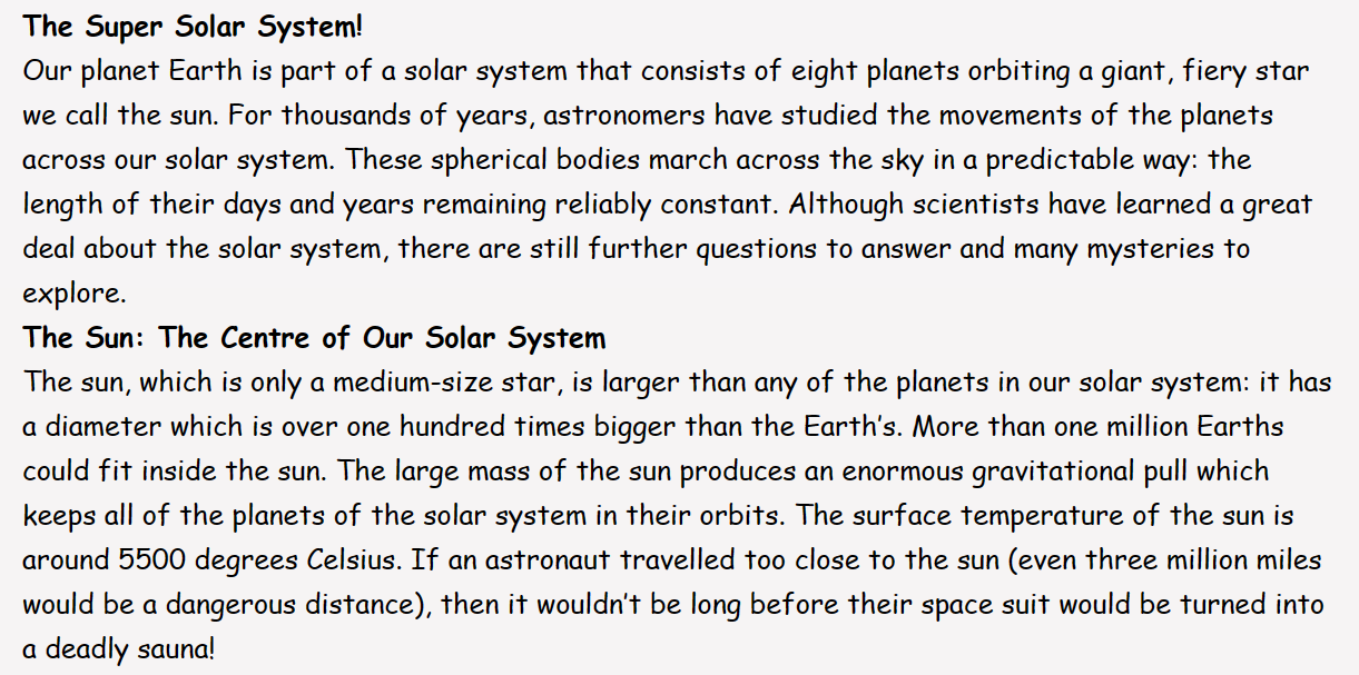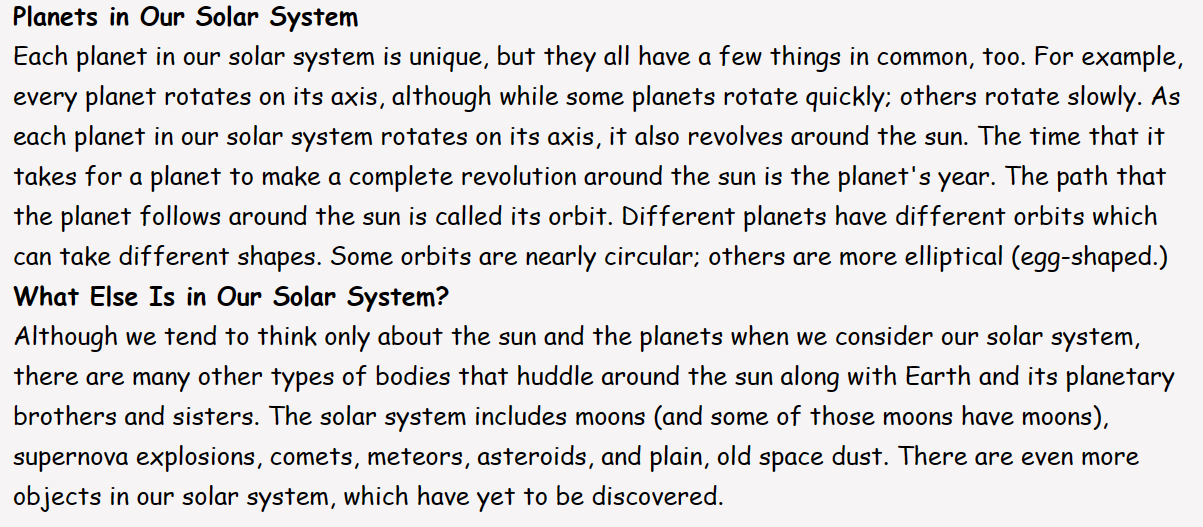 What technical vocabulary would you expect to see in a text about The Solar System?