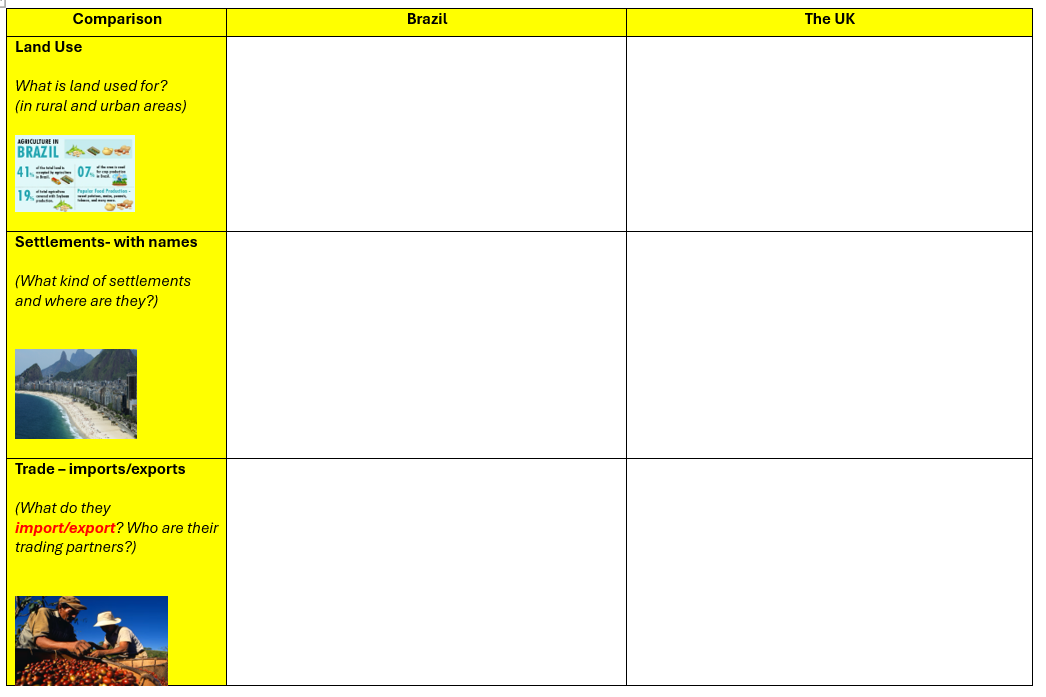 LC: to compare and contrast human features of Brazil and the UK with regards to land use, settlements and trade.