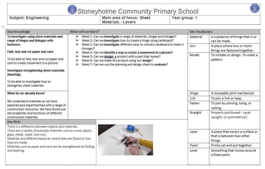As engineers, we will investigate fastening and strengthening materials using hinges and linkages. We will design, make and evaluate a product using the skills we have developed.