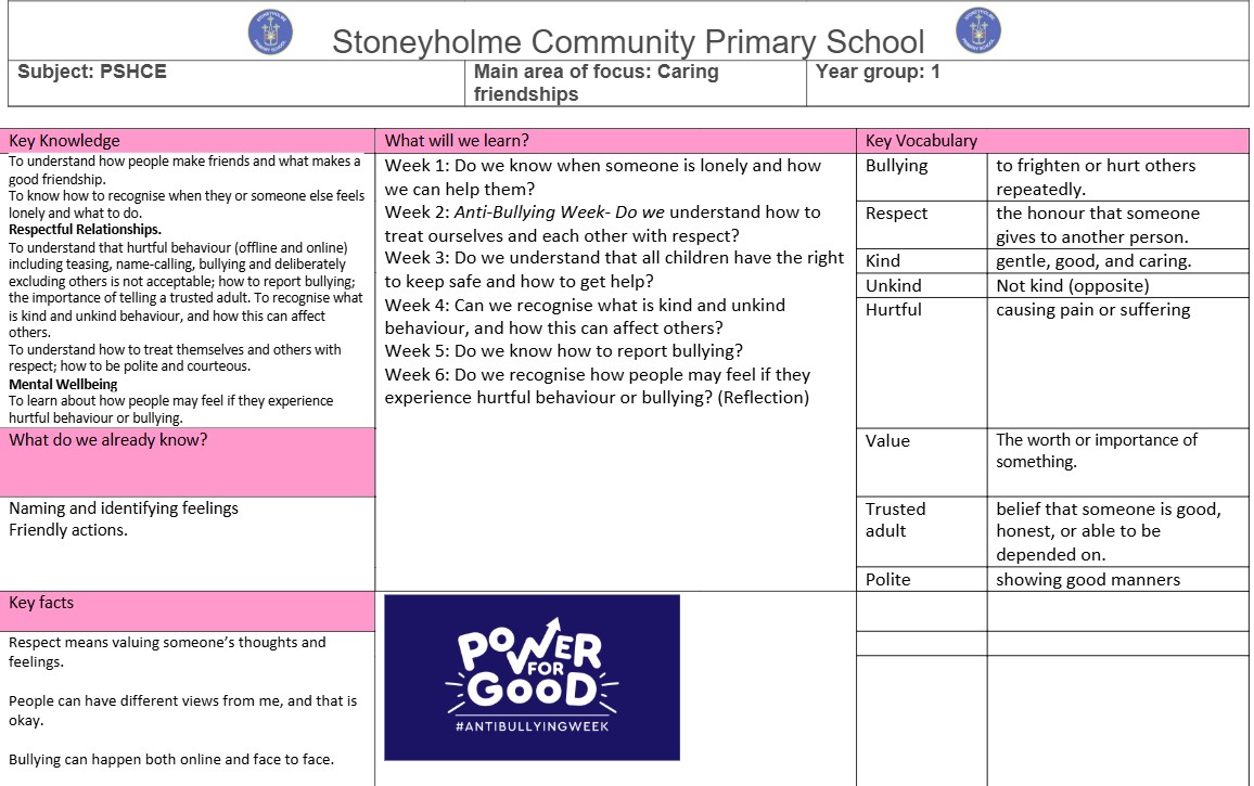 As citizens, we will explore what a good friendship is and recognise when someone feels lonely and what to do. As part of our learning about respectful relationships, we will learn about unkind behaviour including bullying (online and offline), how others feel and how we can treat ourselves and others with respect.