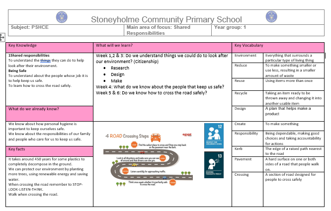 This half term we will consider our responsibility to take care of our environment and learn about whose responsibility it is to take care of us. We will also learn about keeping ourselves safe when crossing roads.