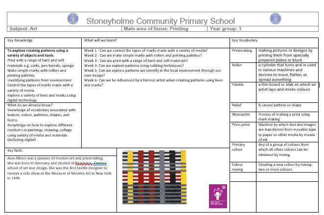 As artists, we will continue to develop our knowledge of lines and marks by making patterns using a variety of objects and tools. We will take inspiration from Anni Albers.