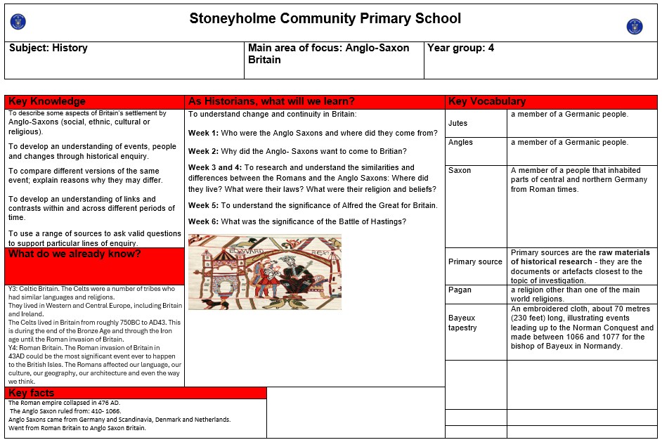 As historians, we will be continuing our learning about groups of people who have invaded and settled in the United Kingdom. This term we will learn about the Anglo-Saxon Age in Britain which was from aroundAD410 to 1066. We will explore the impact that the new groups of settlers had on society. We will be using primary and secondary sources of information.