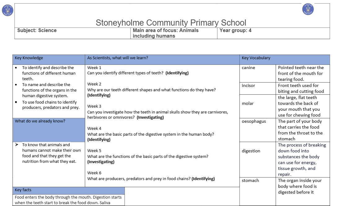As scientists, we will learn to identify and describe the different types of human teeth and their functions. We will name and describe the organs in the human digestive system and explain what they do. We will use food chains to identify producers, predators, and prey.