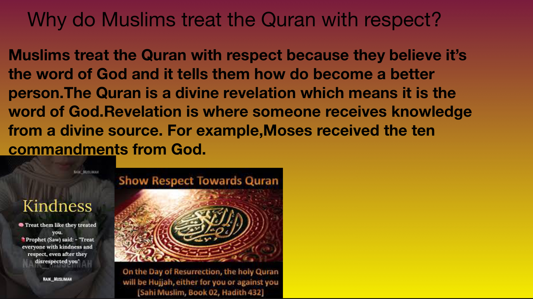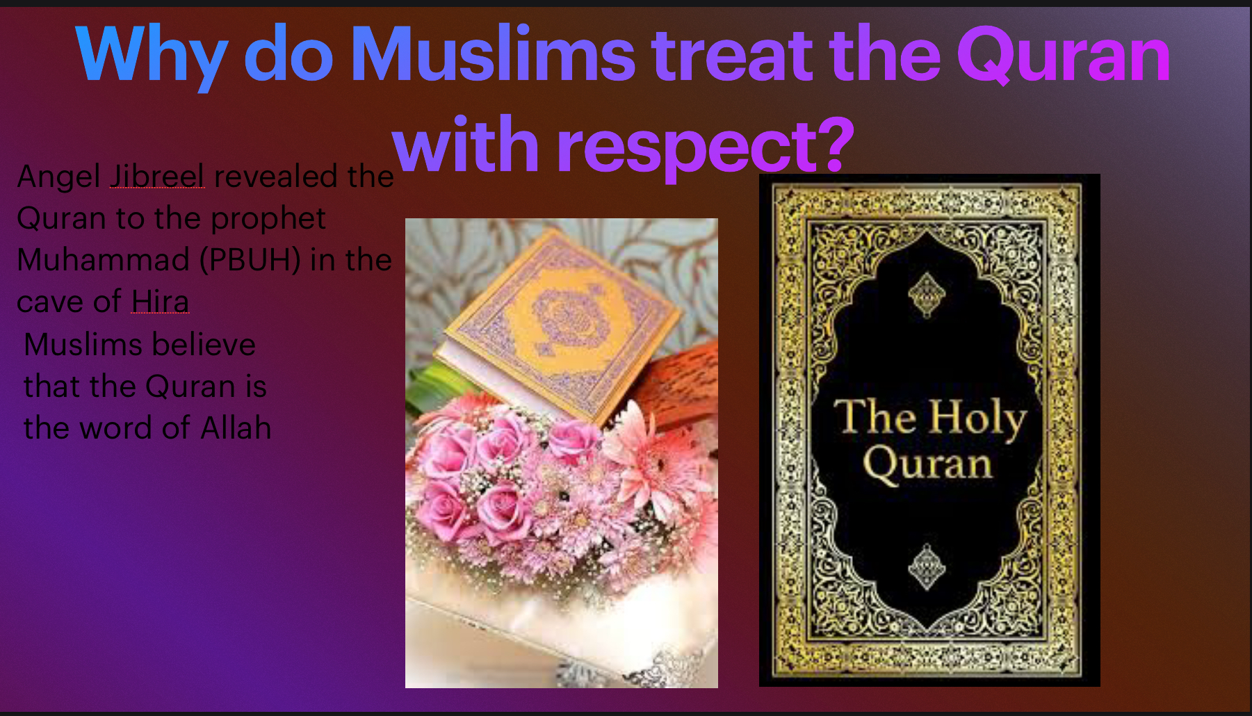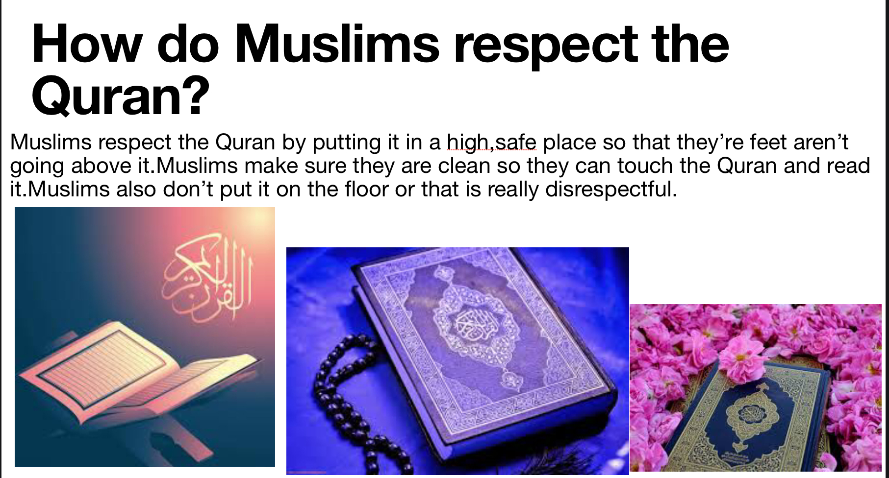 We made some Key Note presentations to showcase our understanding of 'How Muslims show respect for the Qur'an and how this symbolises their respect for Allah'. Here are a few examples of our wonderful work: