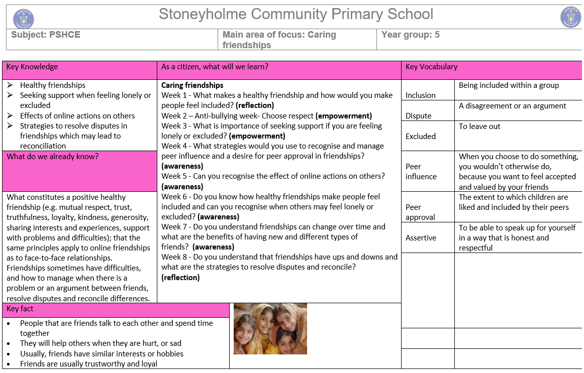 The pupils will reflect on Caring Friendships this half term, exploring strategies to maintain good friendships and good mental health. We will return to the important issue of online safety and look at how we maintain respectful communication online and in real life.