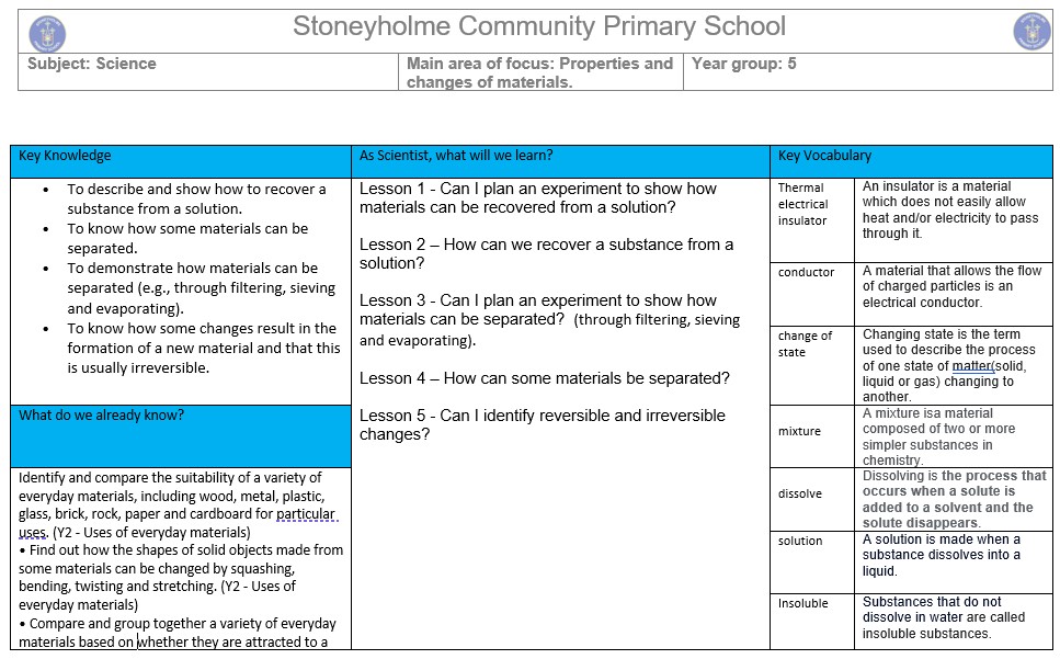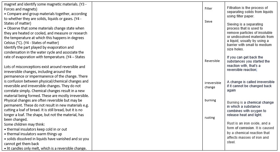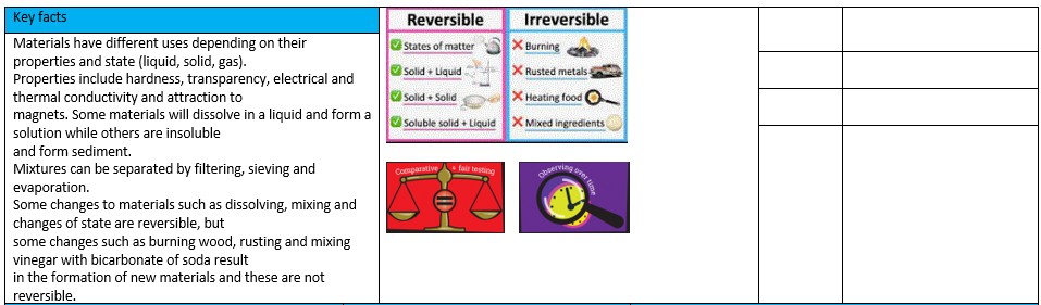 In Science this term, we will continue our study of materials and their properties, looking at change. We will plan and carry out experiments to separate different materials through a range of processes including filtering, sieving and evaporation. The pupils will explore why some changes are reversible and others irreversible.