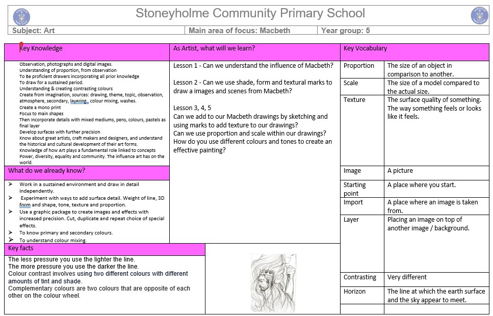We will conclude our study of Art by using the inspiration of our English drama script - Macbeth - to create art based on this play. The pupils will learn about light and dark lines, colour contrasts, tints and shades and perspective. Pupils will use their own understanding of Macbeth to create an image of one of the characters using their art skills.
