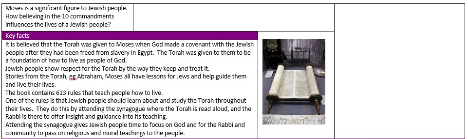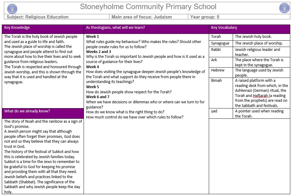 Our RE study this term will focus on Judaism. Pupils will learn about the Torah and how this holy book is viewed in the Jewish world. We will look at the Jewish place of worship, the synagogue, and learn about the religious leaders and how they guide their believers.