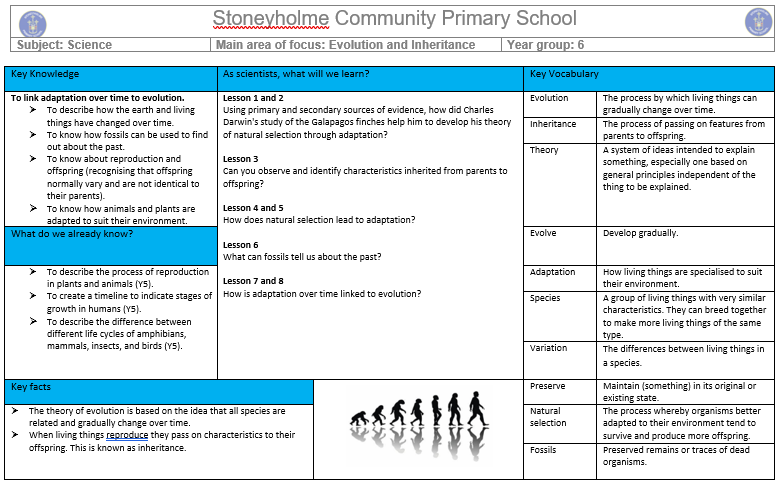 Whilst learning about evolution and Darwin’s theory, it will help us to understand how living things change over time. We will discover how animals and plants adapt to survive in their environments, and how humans share connections with other species. We will learn about natural selection and the amazing diversity of life on Earth.