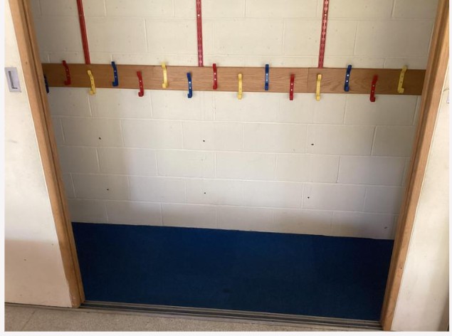 We hang our coats up in the cloakroom, using the bottom pegs first.