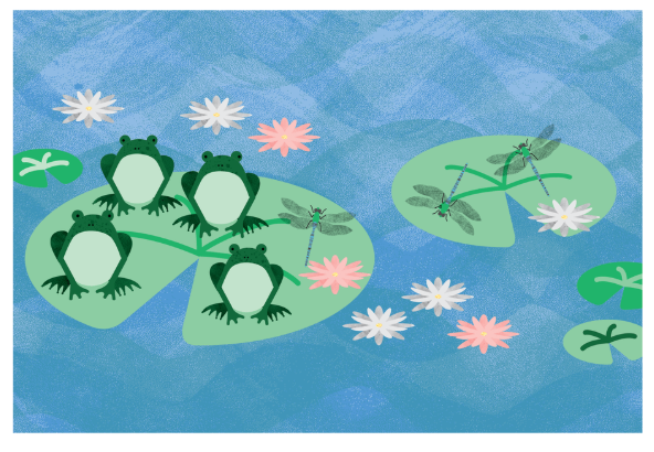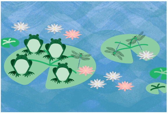 There are 4 frogs. There are 3 dragonflies. 4 and 3 make 7. There are 7 animals altogether!