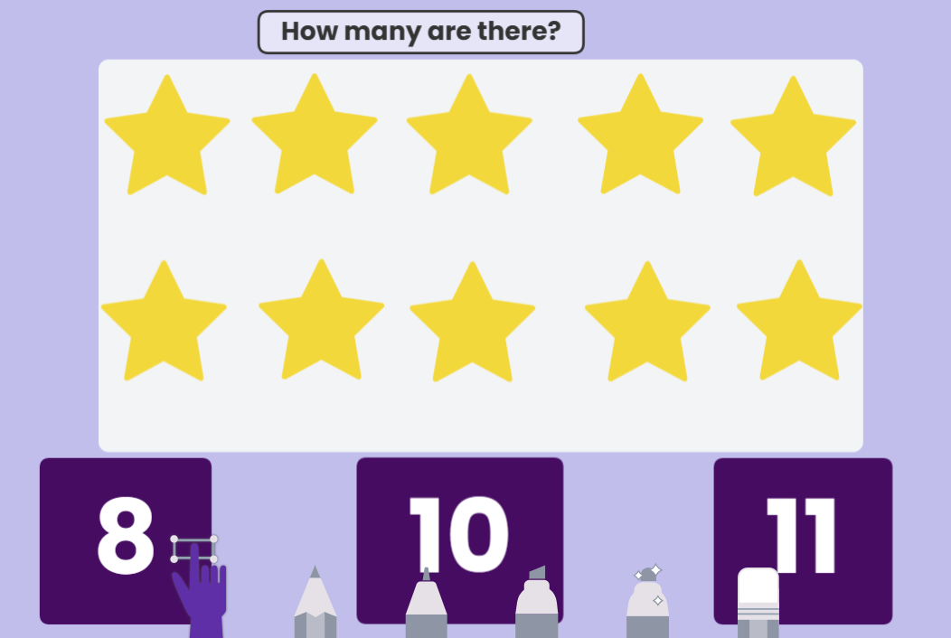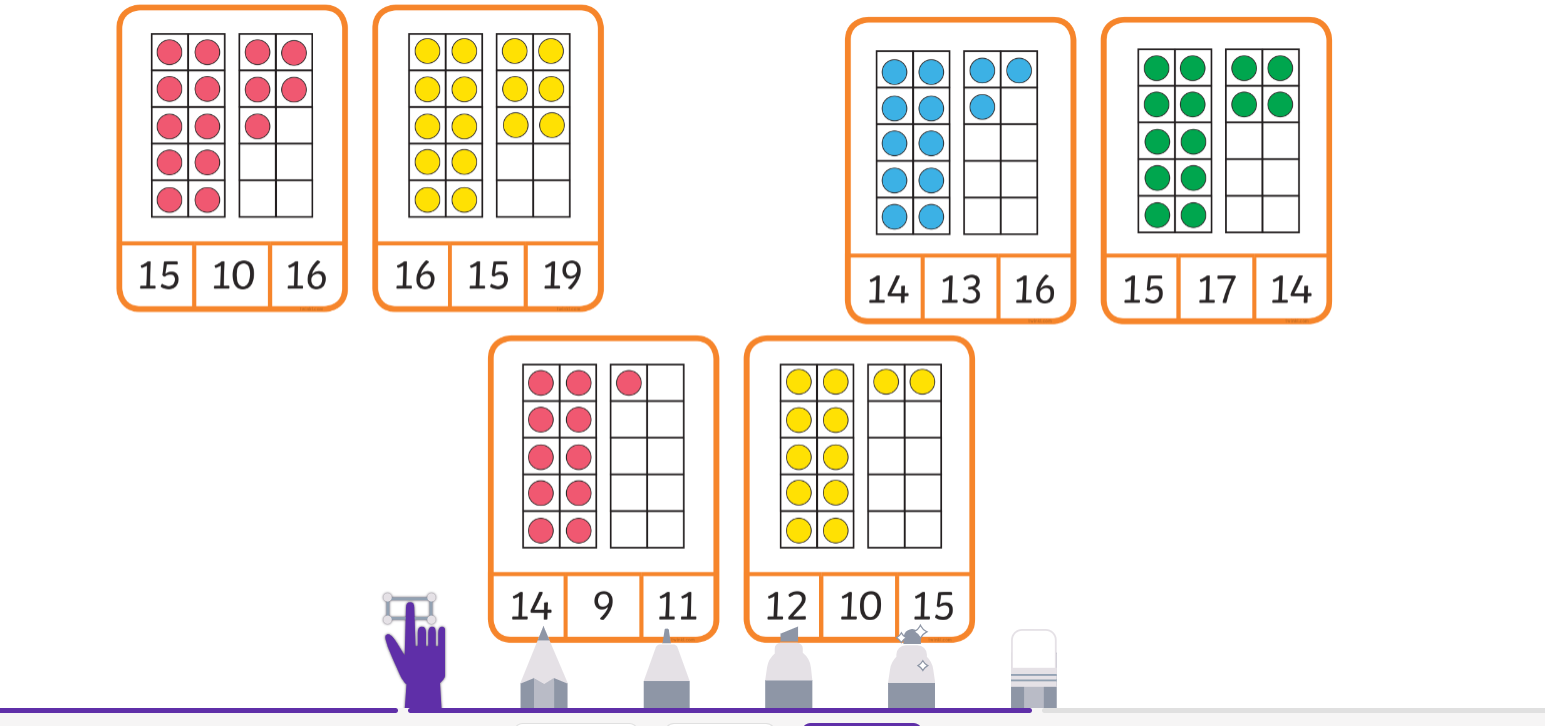 In pairs, children make the number using ten frames- filling 10 first. Discuss the number being 10 and another number.