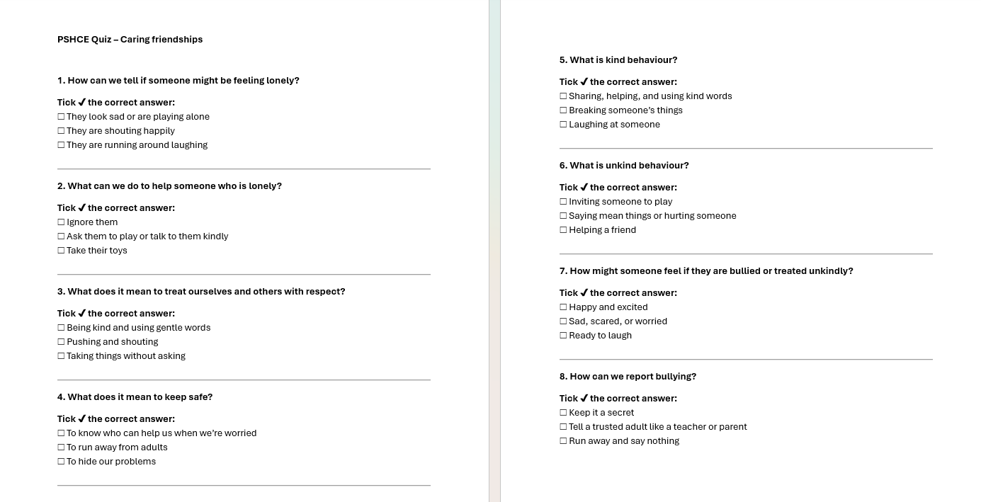 Today we will complete a quizlet to show what we have learned, what we know and what we have remembered about kind and unkind behaviour, including bullying.