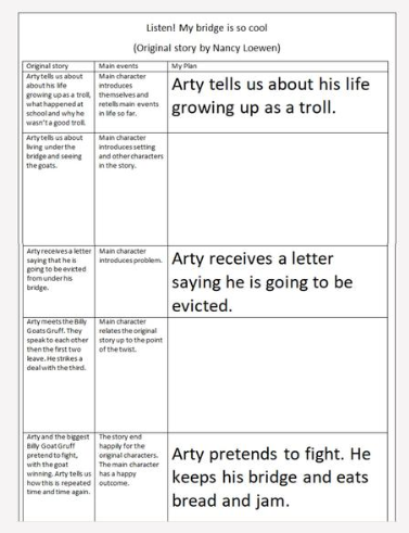 Today, we are going to record the ideas we have about a twist to the plot. Remember, we are going to keep the same beginning and end but we can change the middle.