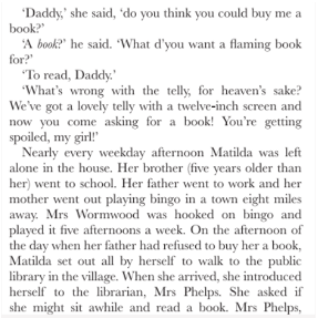 I am going to model inferring character feelings. Here is an extract taken from Matilda by Roald Dahl: