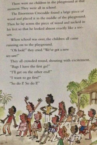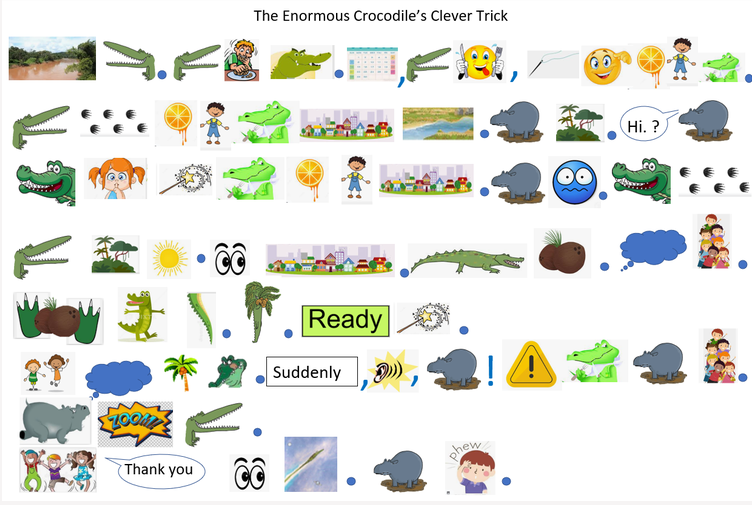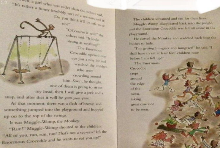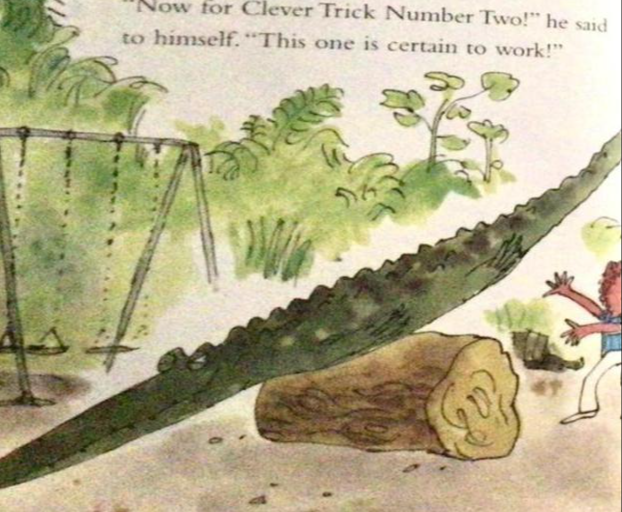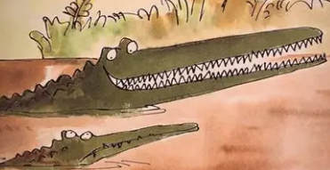 We inferred from the picture that The Enormous Crocodile is probably feeling hungry because he is showing his sharp teeth.