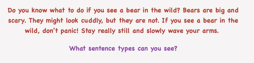 In your books, you are now going to write a short piece using the three different sentence types. You will write about a Lion.