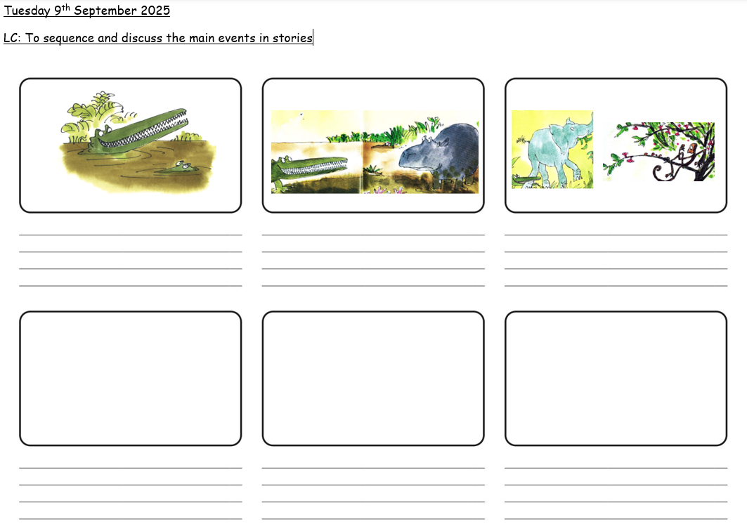 Today we are going to orally retell the story of "The Enormous Crocodile" so far, using a storyboard to help us.