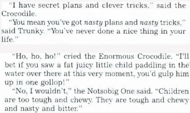 The Enormous Crocodile said, “I am so hungry now I want to eat six children.”