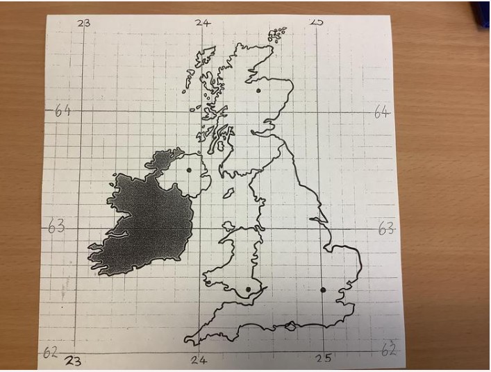 - First, find the four-figure grid reference but leave a space after the first two digits.