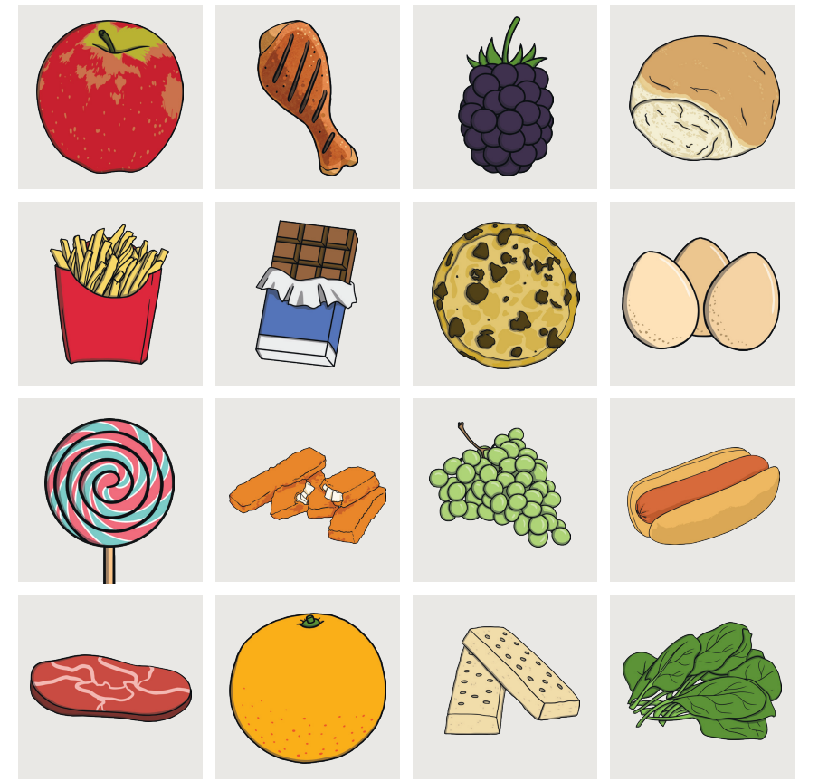 - Round 2: Once guessed, the team must decide if the food is healthy or unhealthy and place it in the correct column on the board.
