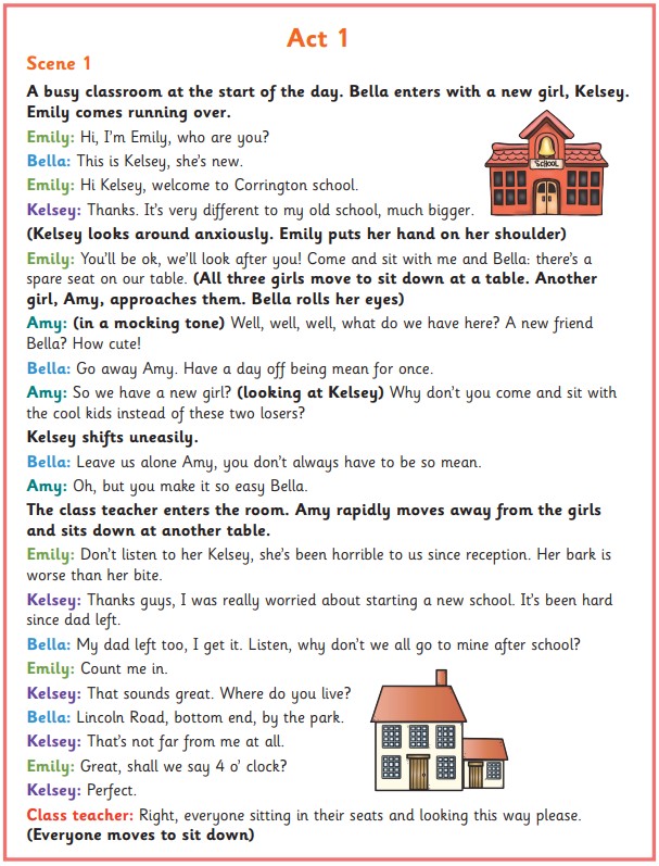 Reading a playscript is slightly different to reading a story. Each character says their own words in their own way. As we read through this playscript, think about what the characters' words and actions tell the reader about them and how the playwright gives us more information about them.