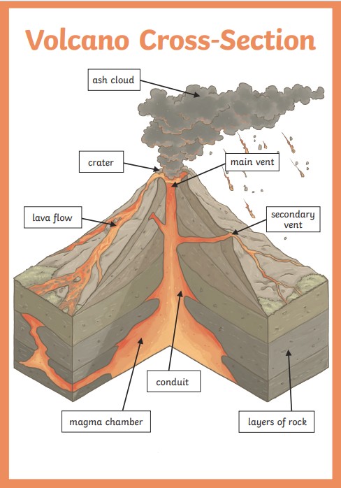 LC: To name the key parts of a volcano and explain them.