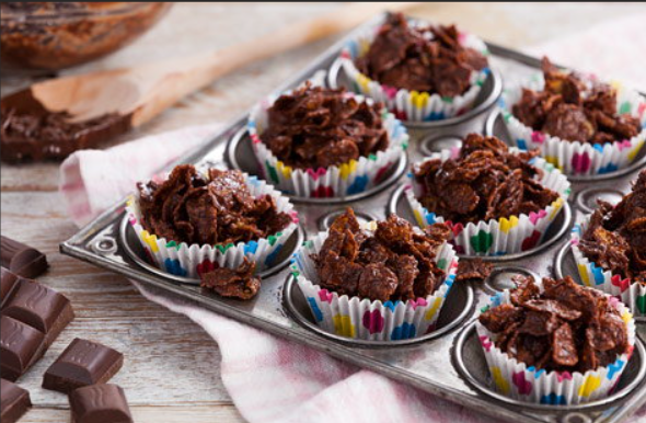 Children: Weigh out the ingredients. Older children can do this by themselves with supervision and little ones can help to pour or spoon ingredients into the weighing scales. Put 50g butter, 100g milk or dark chocolate, broken into chunks and 3 tbsp golden syrup in a saucepan or microwavable bowl. Put 100g cornflakes in another large bowl.