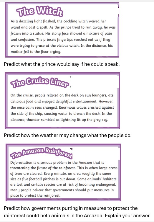 Now we will work together and think about our responses to these questions to help us make predictions. Remember - your predictions may be different to someone else's. As long as you have used the evidence in the text, that is fine.