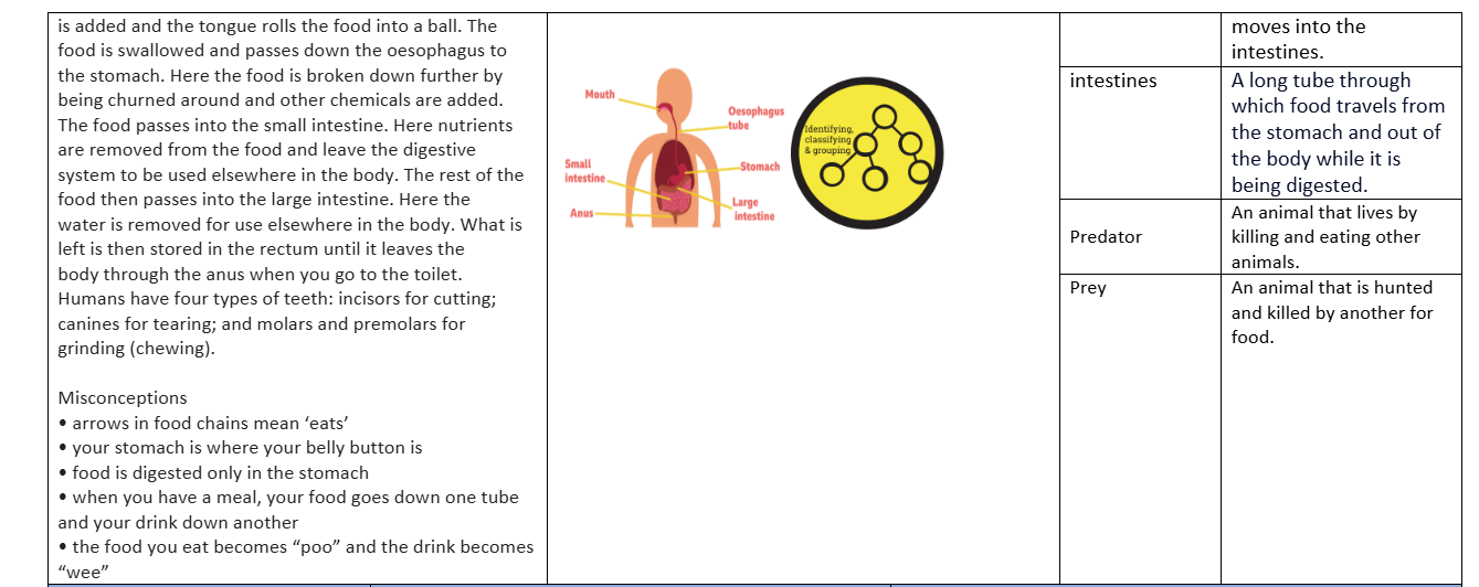 As scientists, we will learn to identify and describe the different types of human teeth and their functions. We will name and describe the organs in the human digestive system and explain what they do. We will use food chains to identify producers, predators, and prey.