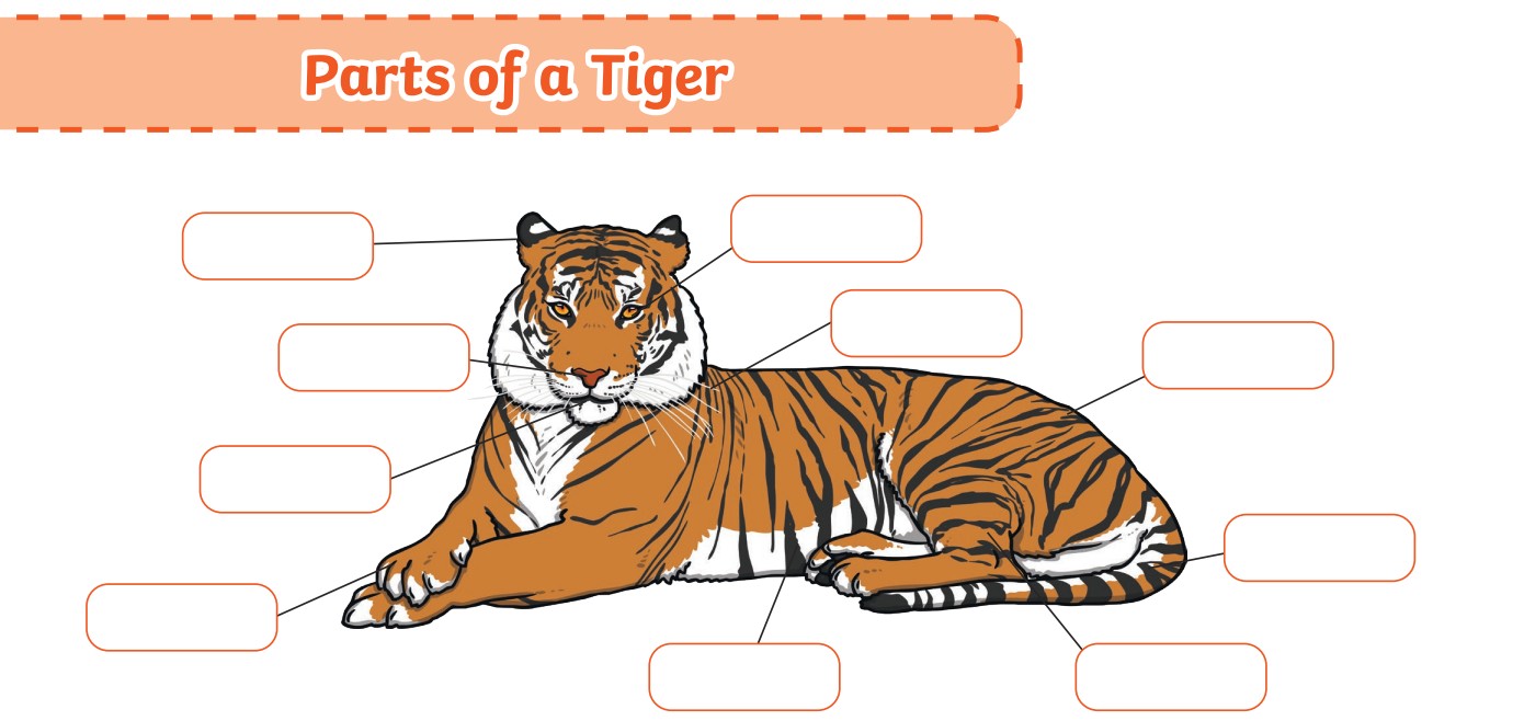 Read the the information about what tigers look like with the teacher. Use what you have read to write the labels on the picture.
