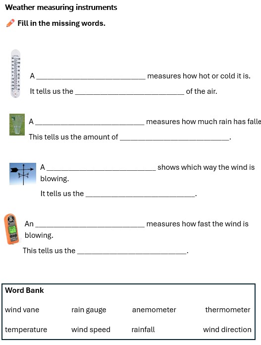 Draw a small picture of each of our weather measuring instruments. Next to each one, write what it is, what it measures, a short explanation of how it works and what unit it measures in.