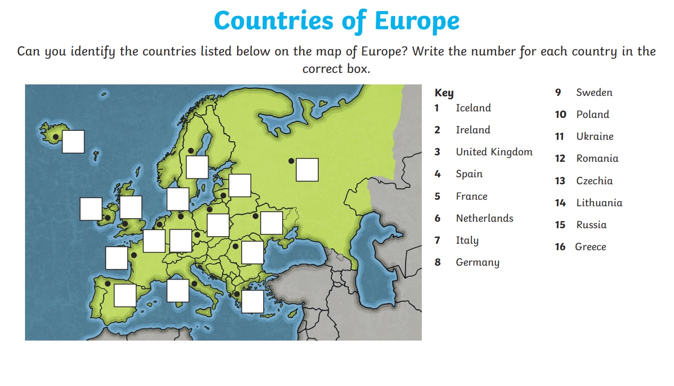 Europe is made up of many different countries. Use the map below and an atlas to identify some of them.