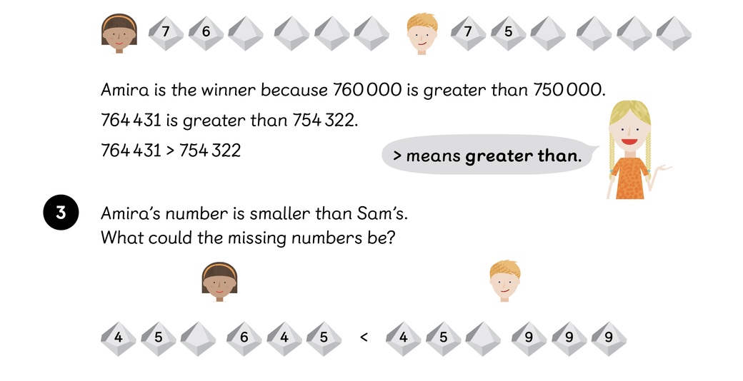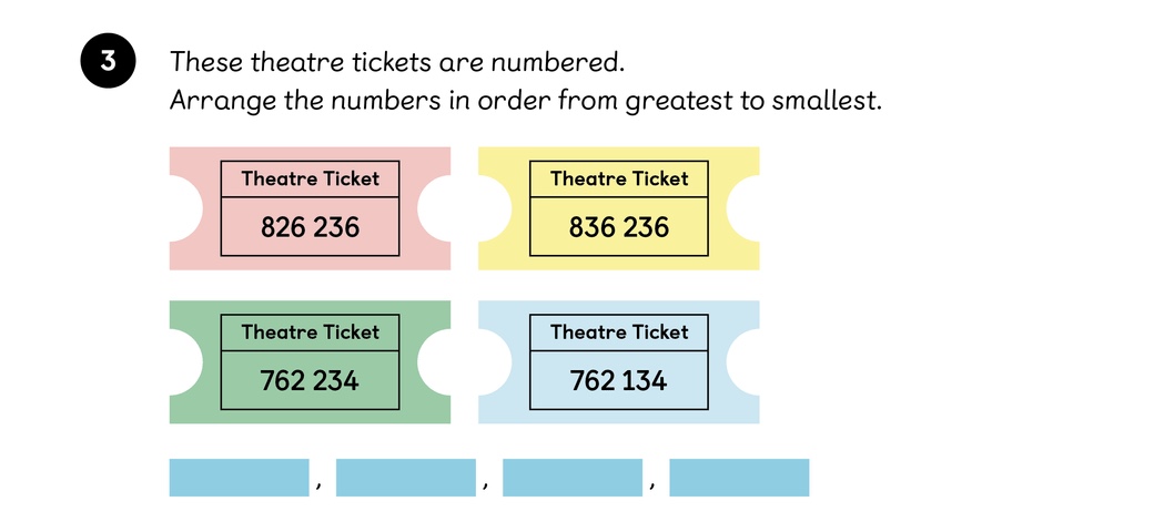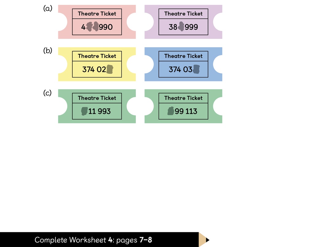 5) Some digits on these theatre tickets have rubbed off. All the numbers have 6 digits. Compare these pairs of tickets. Can you tell which is the greater number? Circle the number if your answer is yes.