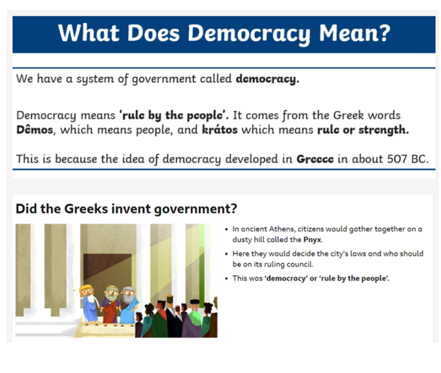 Watch your teacher model how to use the QUADS table to find information helpful for her model report about democracy.