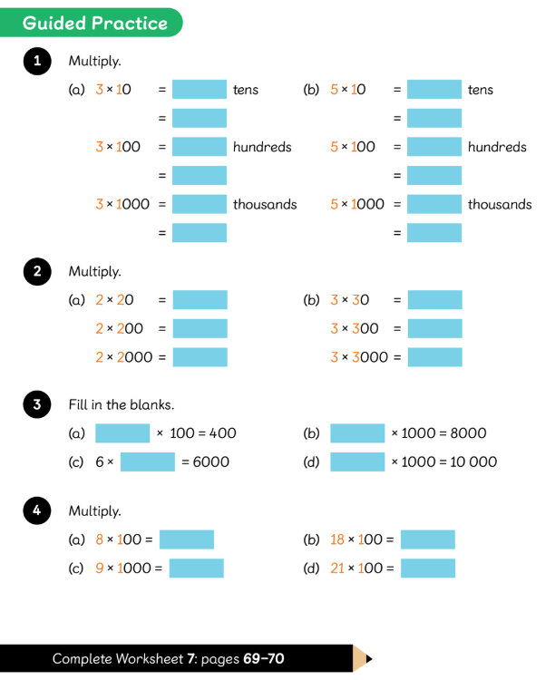 LC: To be able to multiply a single-digit number and 2-digit numbers by 10, 100 and 1000.