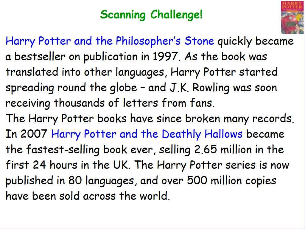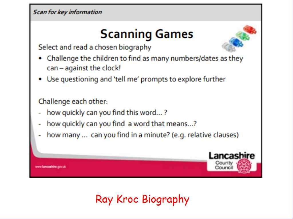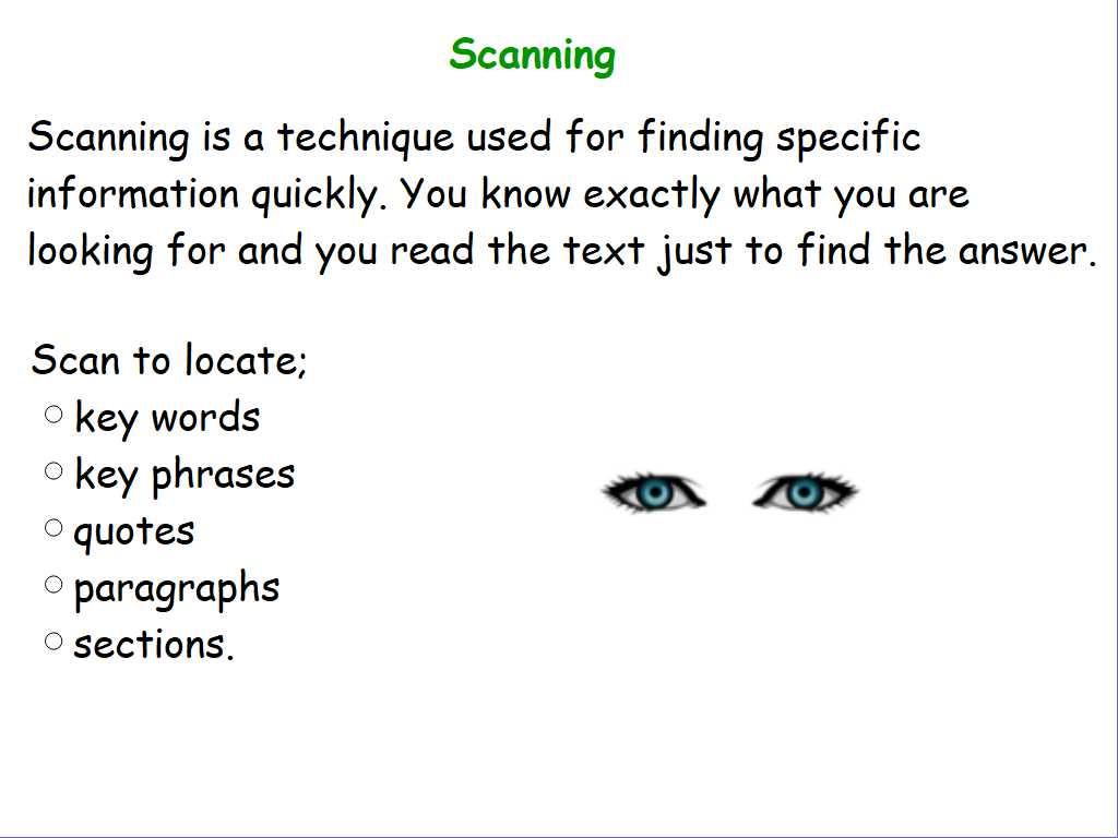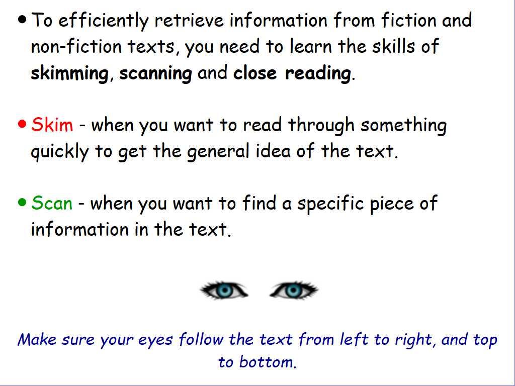 LC: To use skimming, scanning and close reading strategies to locate specific information.