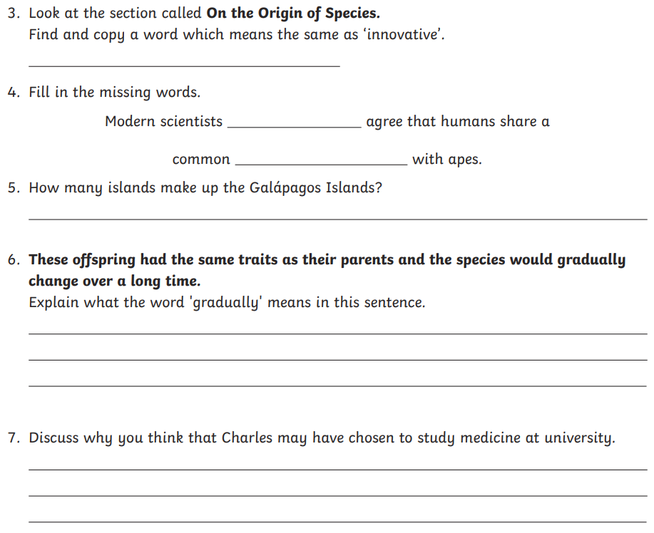 Charles was worried that his idea of evolution by natural selection would be controversial and groundbreaking. The Christian religion teaches people that God created everything but Charles’s theory of evolution challenged that idea. Therefore, Charles decided that he needed to gather more evidence before he introduced his ideas to the world. In November 1859, Charles published all of his research in his book ‘On the Origin of Species by Natural Selection’. ‘On the Origin of Species’ (as it is commonly known) was an international bestseller. He updated the book many times and, later, introduced the phrase ‘survival of the fittest’ as a replacement for ‘natural selection’ in the book. Charles went on to write another book, ‘The Descent of Man’, where he suggested that humans may have evolved from another species. Even though Darwin had no fossil evidence at the time to prove this idea, modern scientists generally agree that humans share a common ancestor with apes, such as chimpanzees and gorillas.